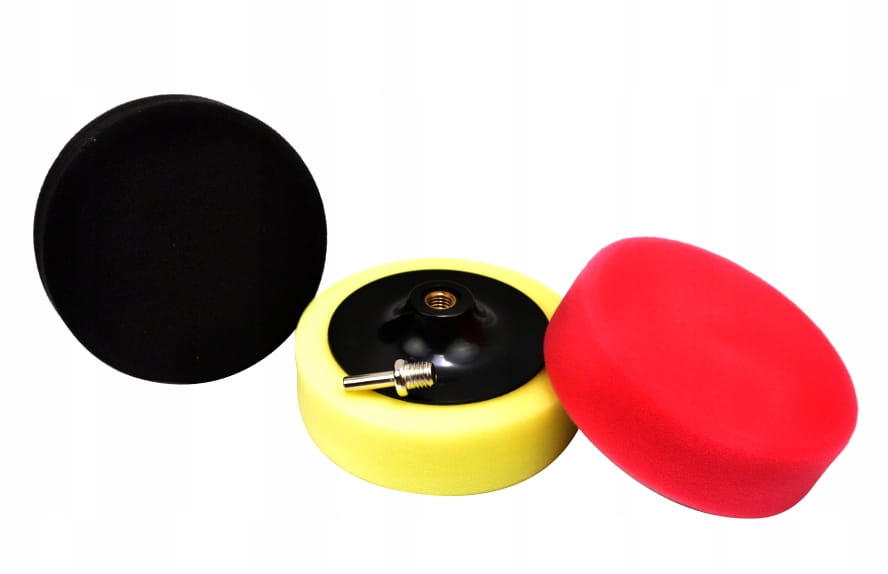 Zestaw gąbek polerskich na dysku. Gąbki o średnicy 150mm przytwierdzone do dysków posiadają gwint montażowy M14, mogą być używane z wiertarkami