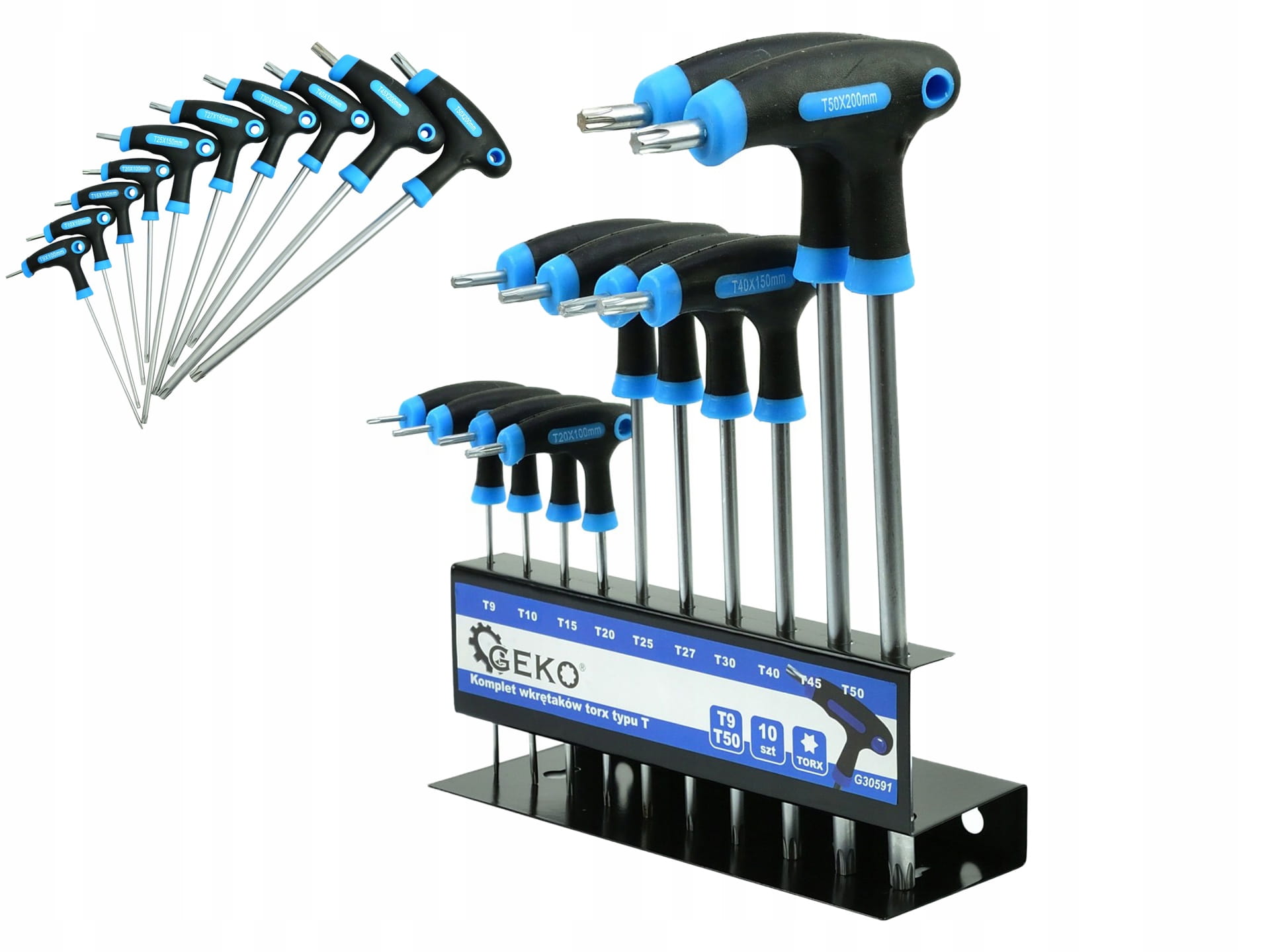 Zestaw wkrętaków Torx typu T. Wykonane ze stali narzędziowej CrV. Posiadają wygodną i ergonomiczną rękojeść. W zestawie 10 wkrętaków w rozmiarach od T9 do T50 oraz podstawka z możliwością zawieszenia na ścianie.