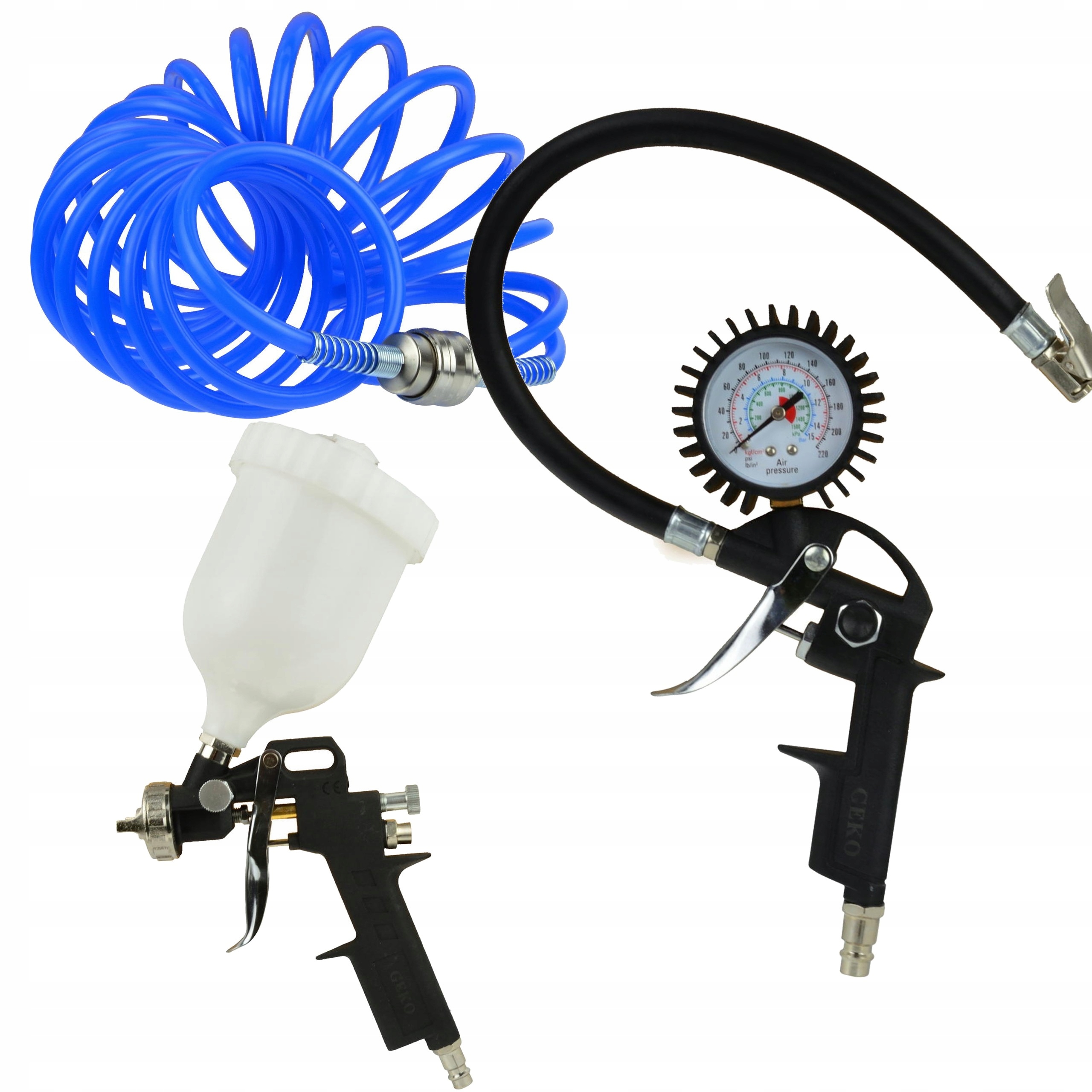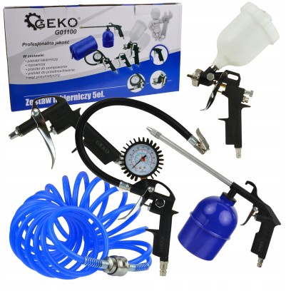 ✔️ Zestaw ten doskonale sprawdzi się zarówno w profesjonalnych warsztatach lakierniczych, jak i podczas domowych prac związanych z lakierowaniem czy pompowaniem kół.