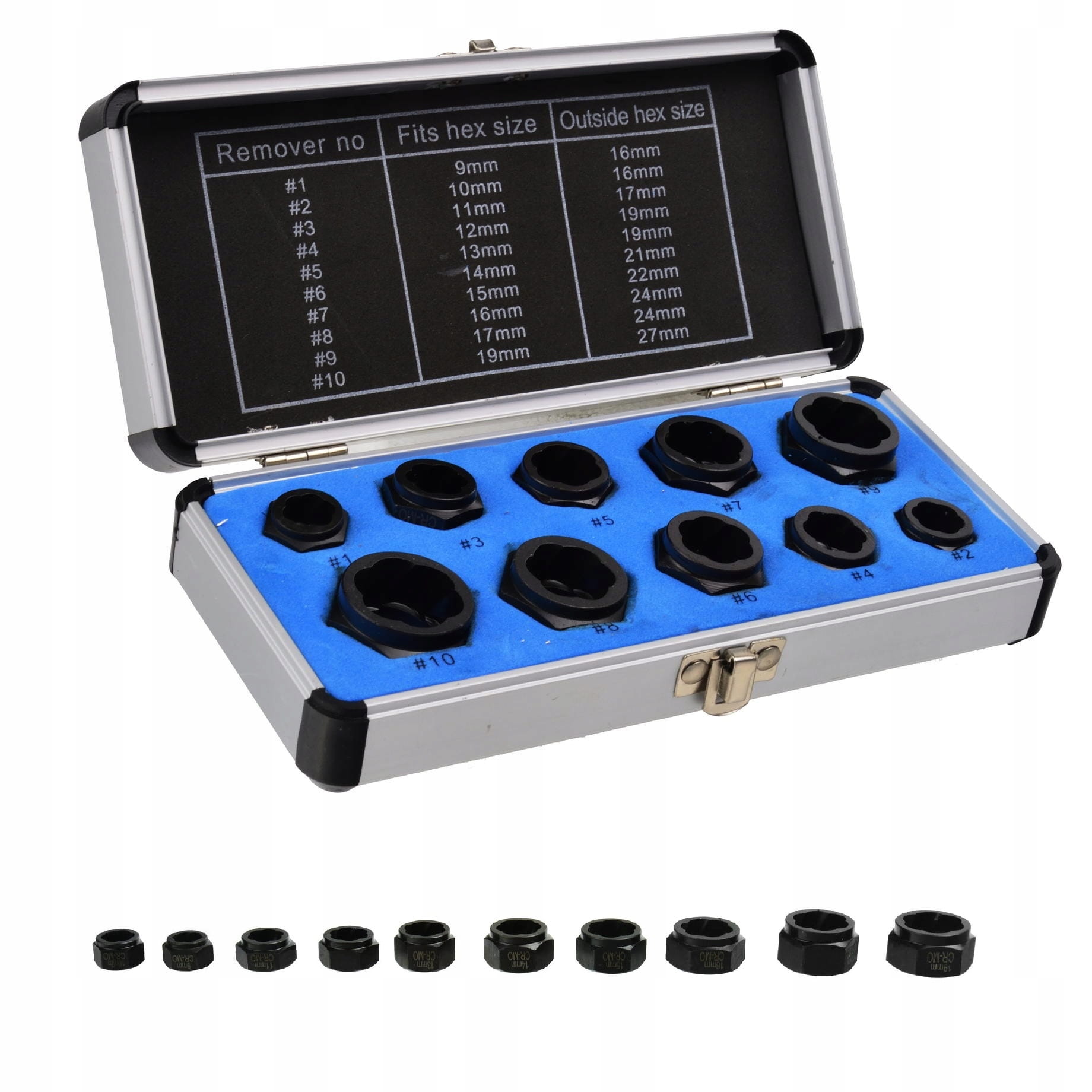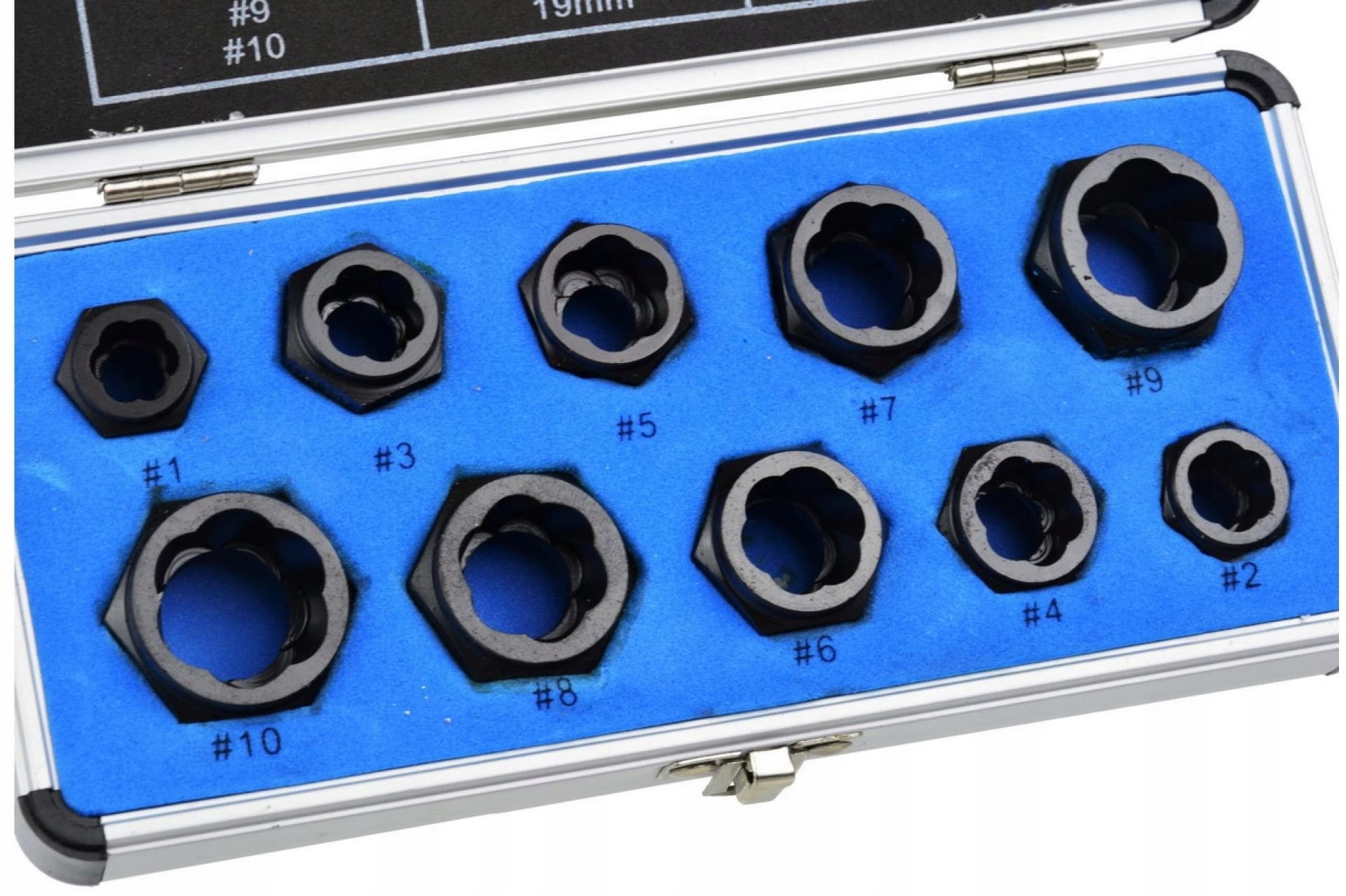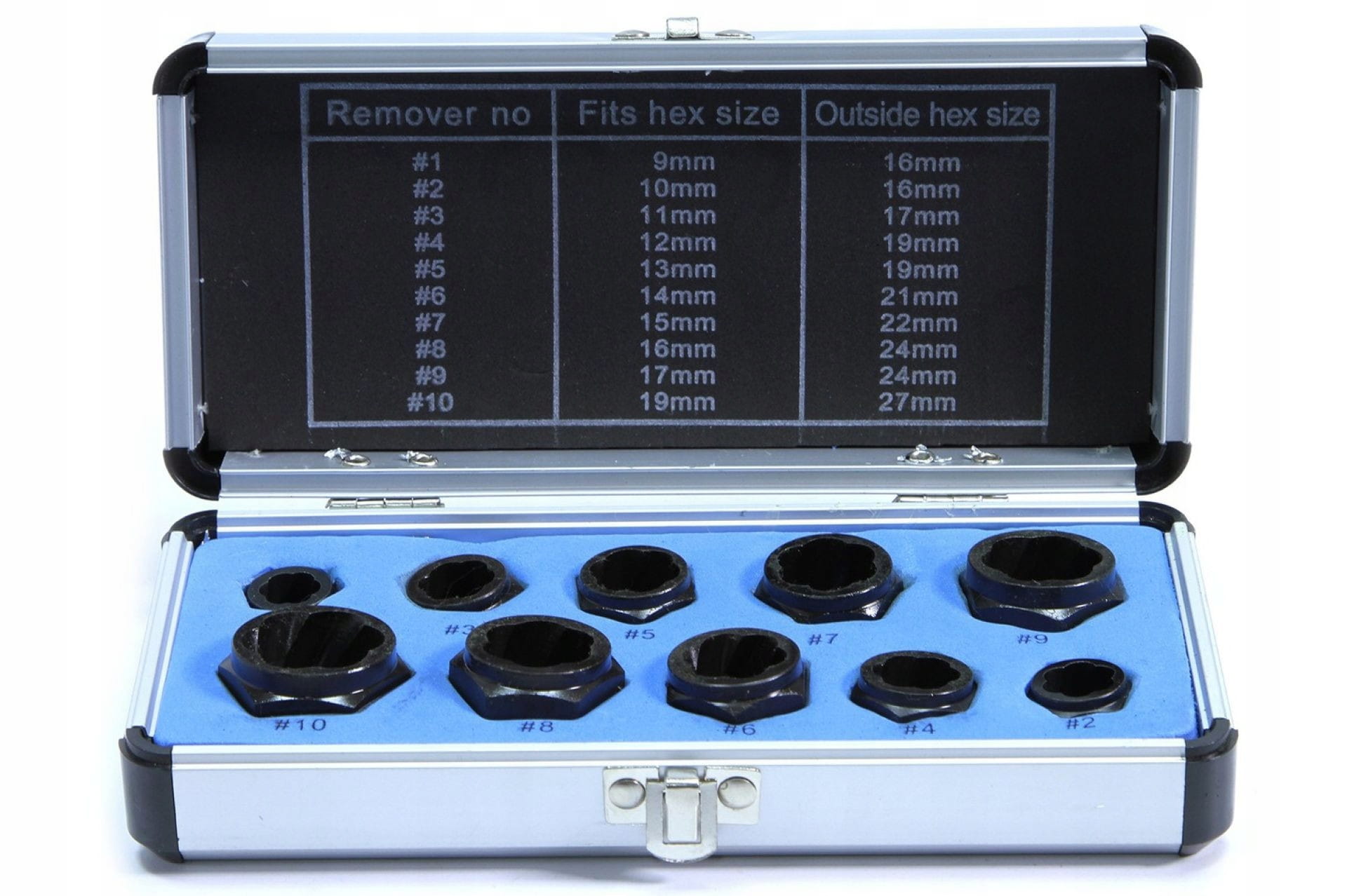 Zestaw do usuwania uszkodzonych nakrętek i śrub o rozmiarze 9 - 19 mm. Specjalny kształt nasadki ułatwiający zaklinowanie się jej na śrubie sprawia że odkręcenie uszkodzonej śruby nie będzie stanowiło problemu. Nasadki wykonano z bardzo wytrzymałej stali chromowo-molibdenowej (CR-MO), co daje im wysoką twardość oraz dużą odporność na uszkodzenia. Zestaw doskonale sprawdzi się w profesjonalnym warsztacie samochodowym, jak i w przydomowym garażu.