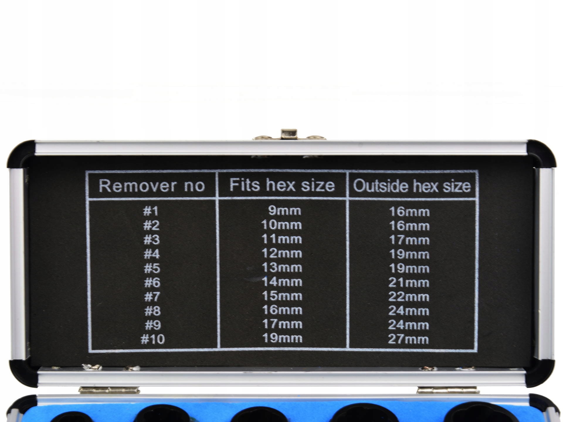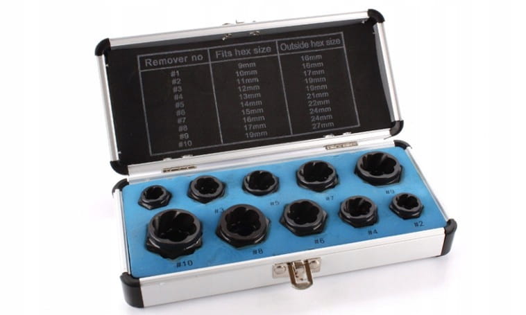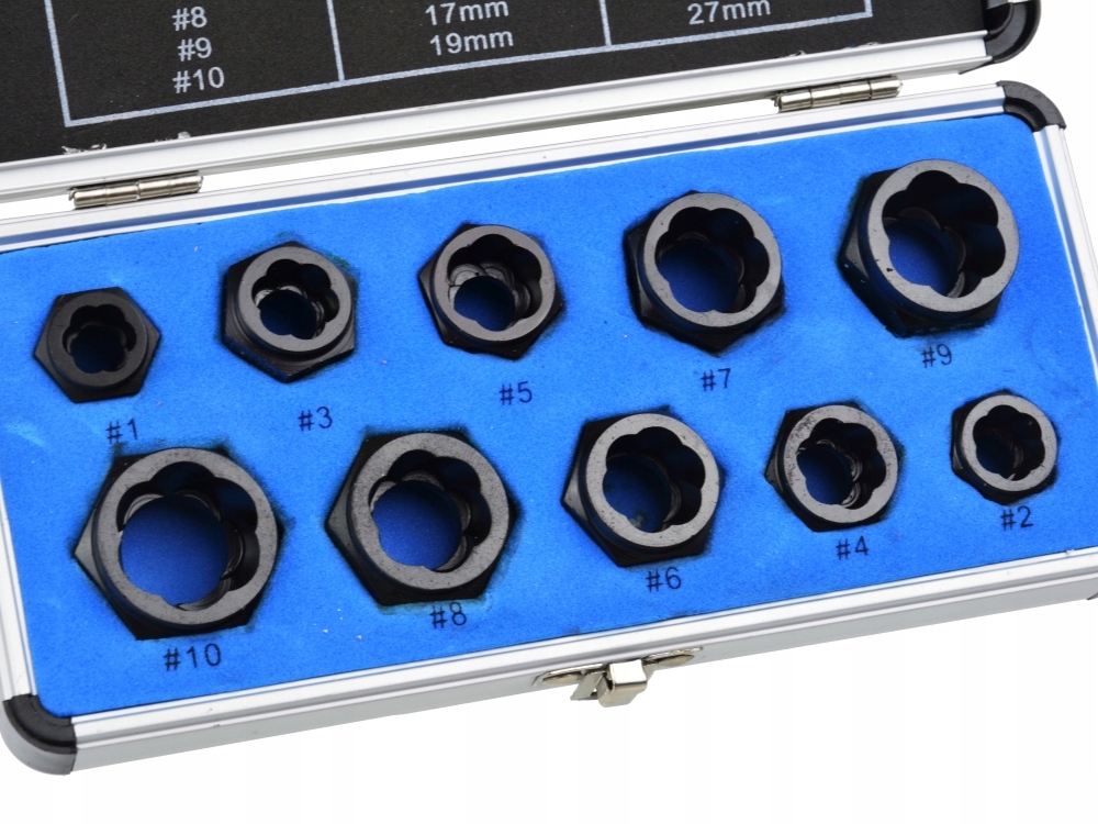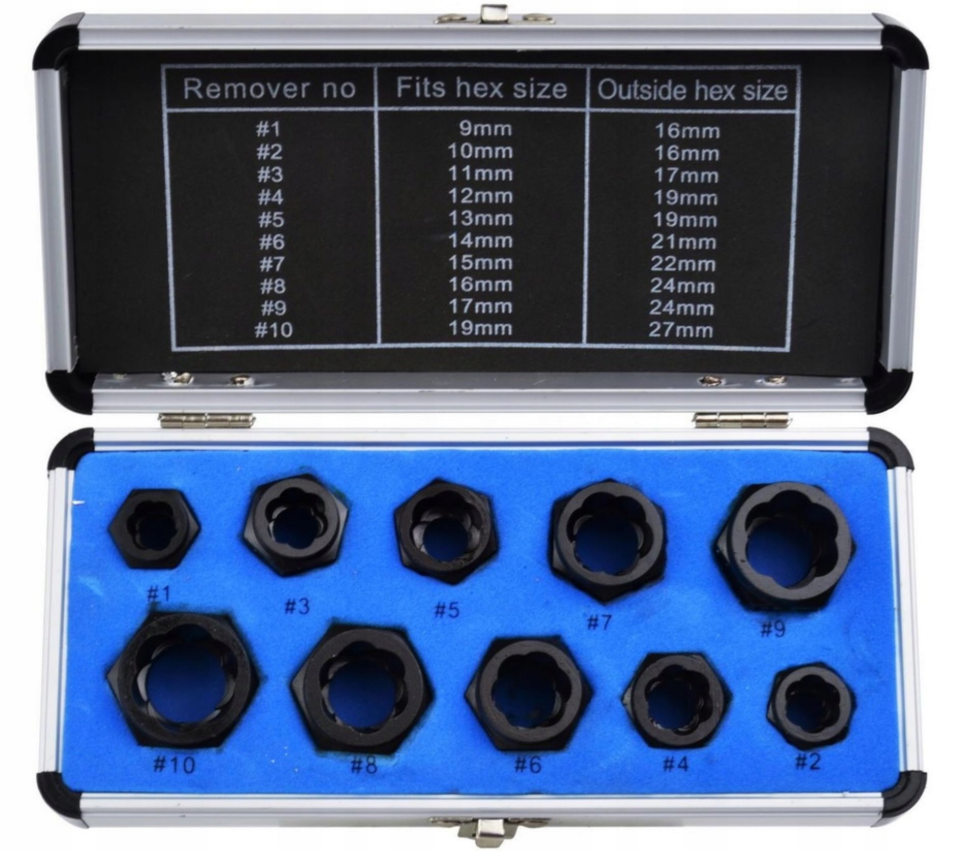 Zestaw do usuwania uszkodzonych nakrętek i śrub o rozmiarze 9 - 19 mm. Specjalny kształt nasadki ułatwiający zaklinowanie się jej na śrubie sprawia że odkręcenie uszkodzonej śruby nie będzie stanowiło problemu. Nasadki wykonano z bardzo wytrzymałej stali chromowo-molibdenowej (CR-MO), co daje im wysoką twardość oraz dużą odporność na uszkodzenia. Zestaw doskonale sprawdzi się w profesjonalnym warsztacie samochodowym, jak i w przydomowym garażu.