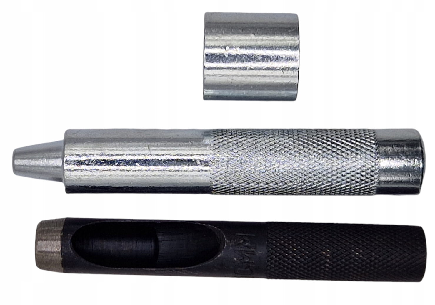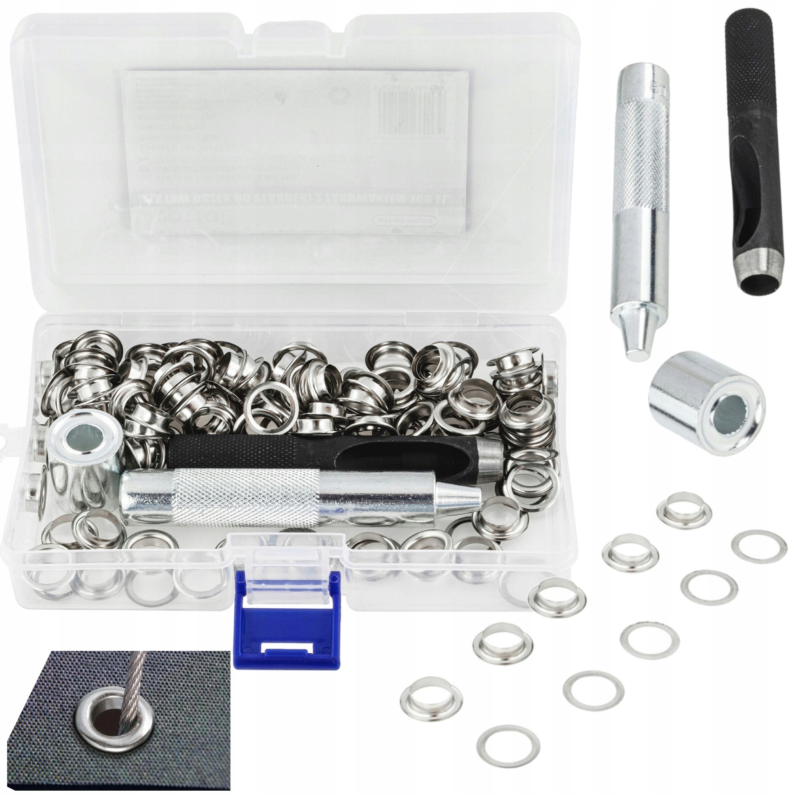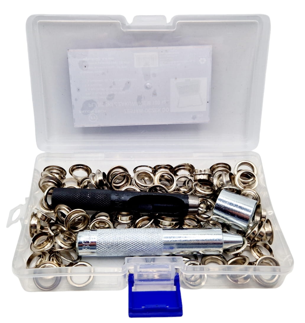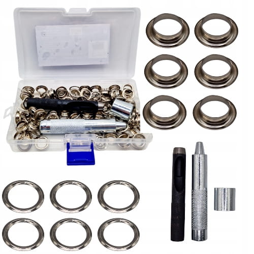 - W zestawie oprócz oczek z podkładkami, znajdują się również akcesoria do robienia otworów mocujących i nabijak do zamontowania oczka (luwersu)