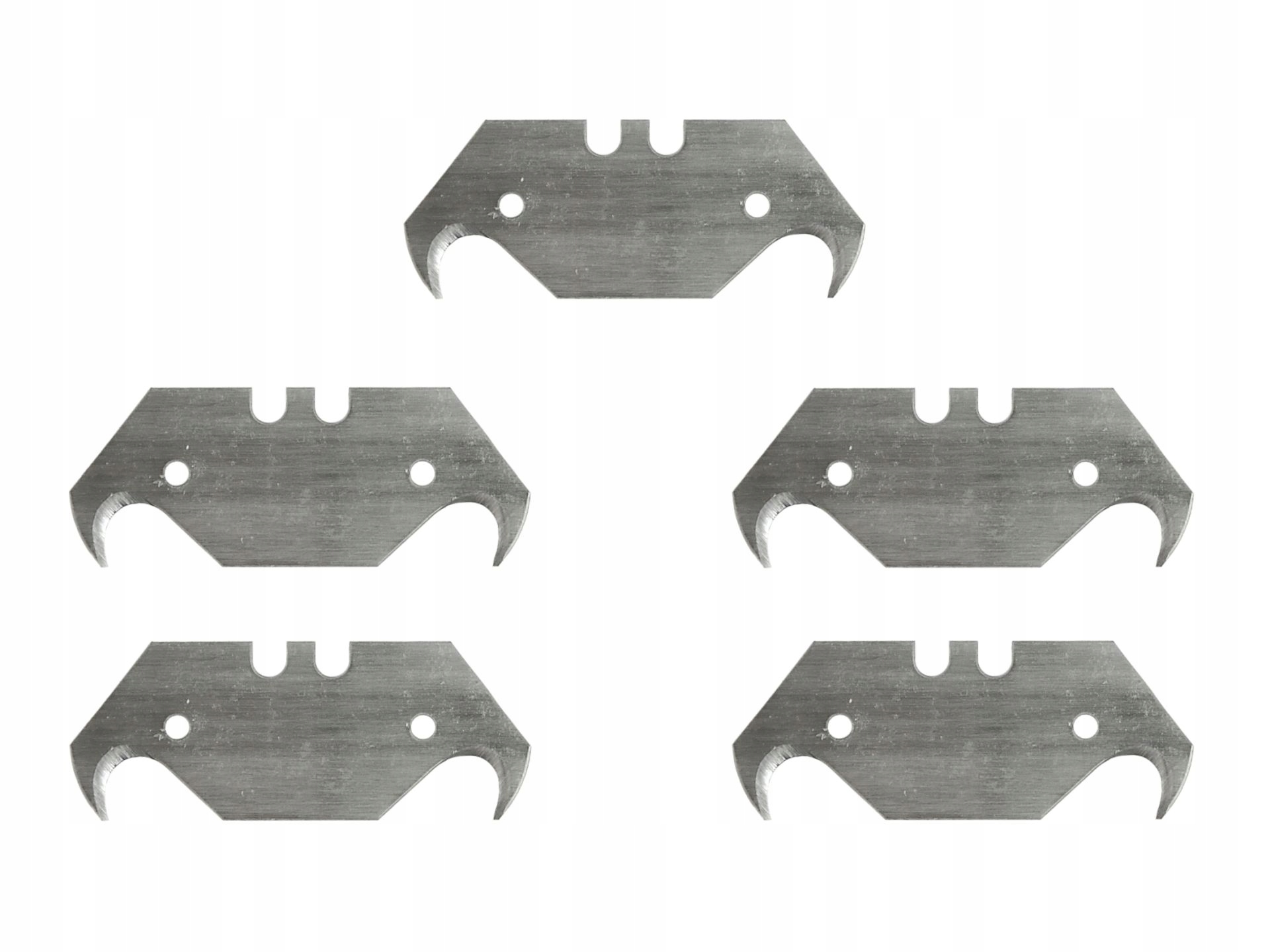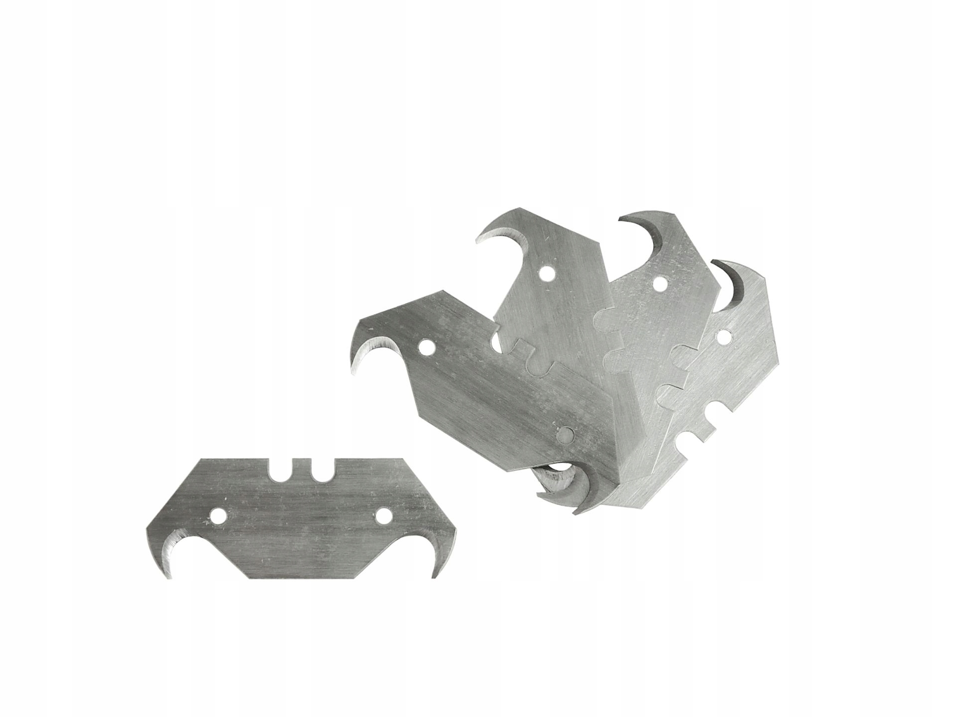 Zestaw 5szt. ostrzy trapezowych hakowych. Wykonane z wysokiej jakości stali narzędziowej. Przeznaczone do cięcia papieru, kartonu, tworzyw, tkanin taśm i skóry. Doskonale sprawdzą się podczas docinania wykładzin podłogowych.