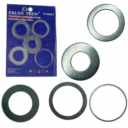 Zestaw pierścieni redukcyjnych do pił i tarcz tnących. Zastosowanie pierścieni pozwala na zredukowanie otworu wewnętrznego ( montażowego ) z 32 mm do pożądanej średnicy. Niezbędne w przypadku stosowania jednego rodzaju tarczy w wielu różnych urządzeniach gdzie występują różne otwory montażowe.