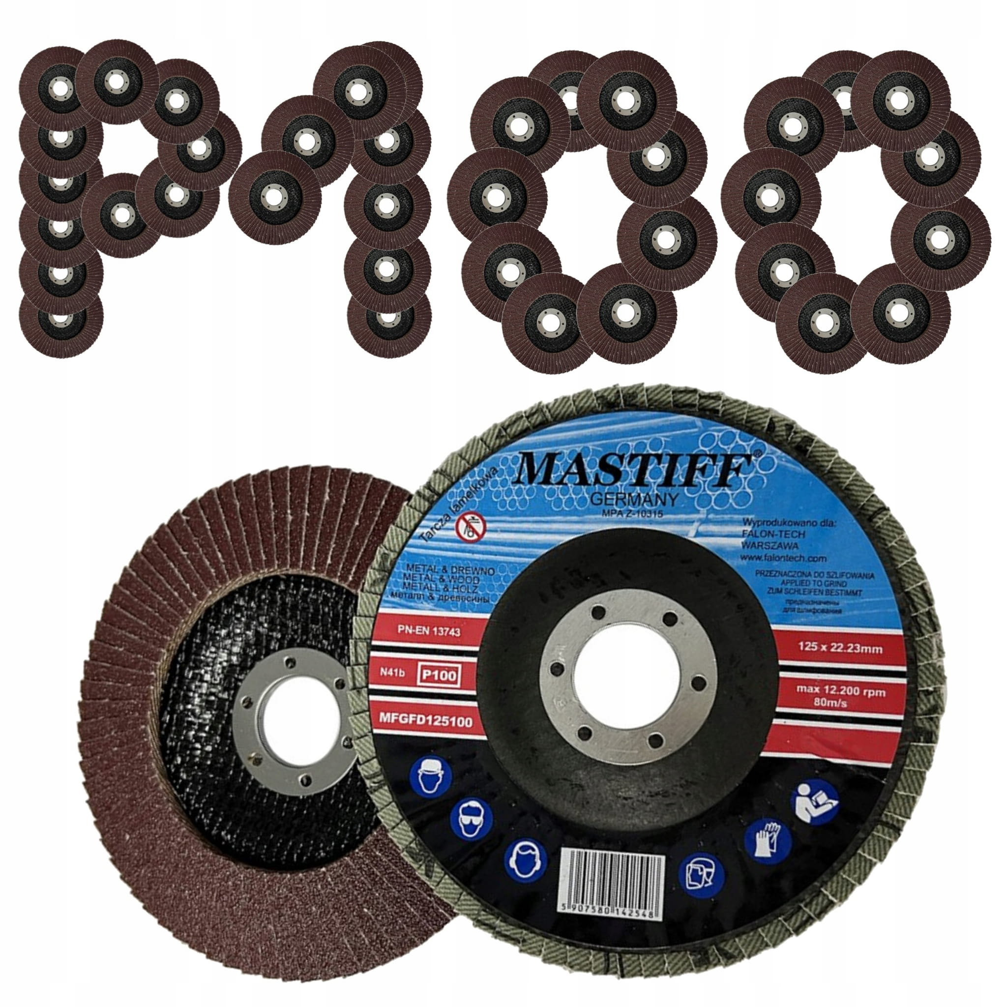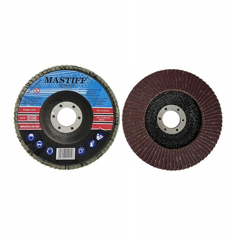 Lamelki do szlifowania MASTIFF POLSKA z płótna z ziarnem korundowym na dysku z włókna szklanego. Wyjątkowo wytrzymałe ziarna ścierne odpowiadają za wysoką wydajność szlifowania i wydłużoną żywotność narzędzia.