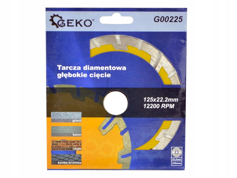 Diamentowa tarcza segmentowa ze szczelinami do cięcia materiałów budowlanych marki Geko, o wymiarach 125x22.2 mm.