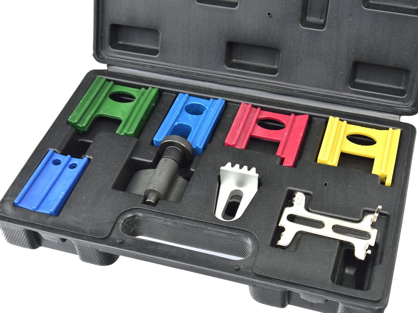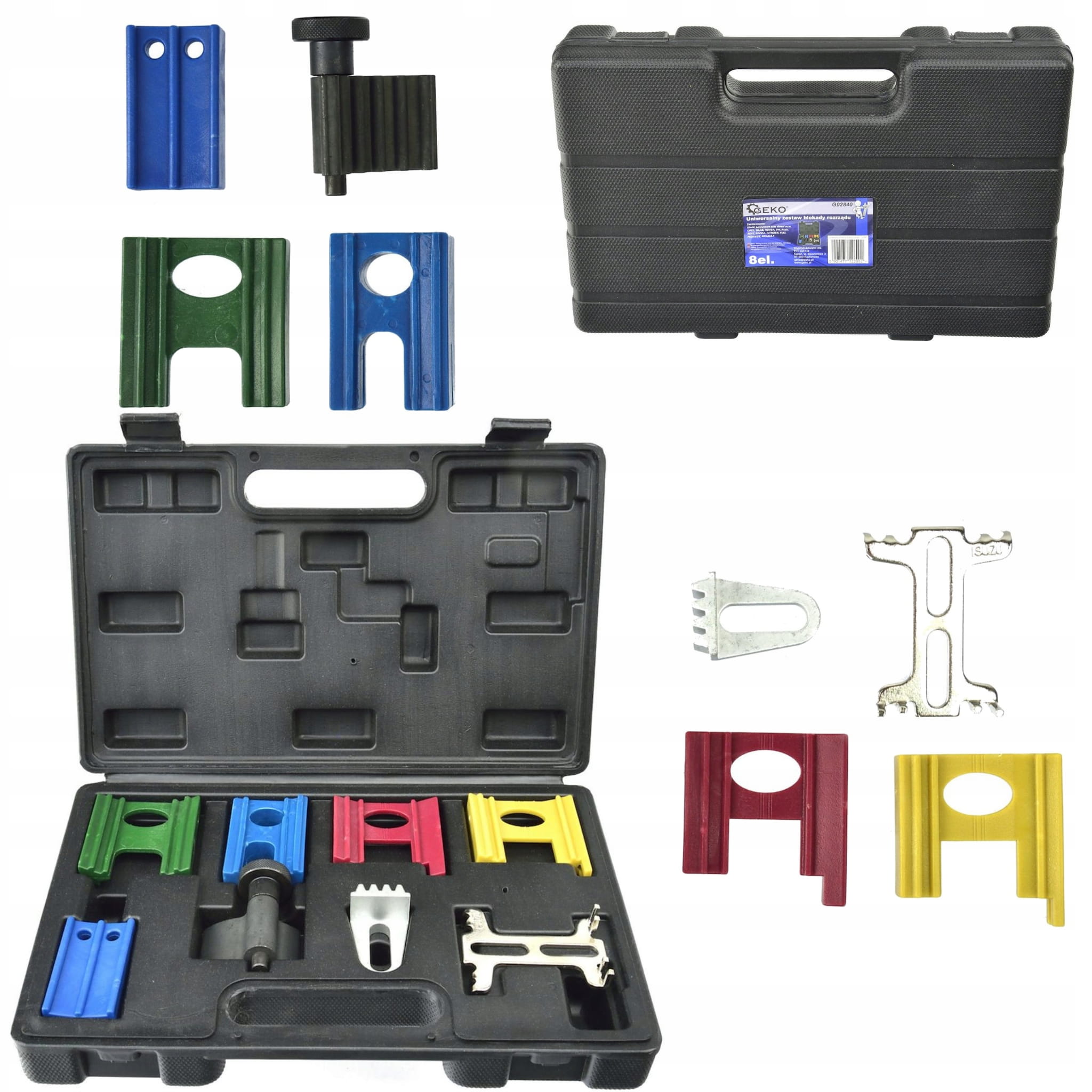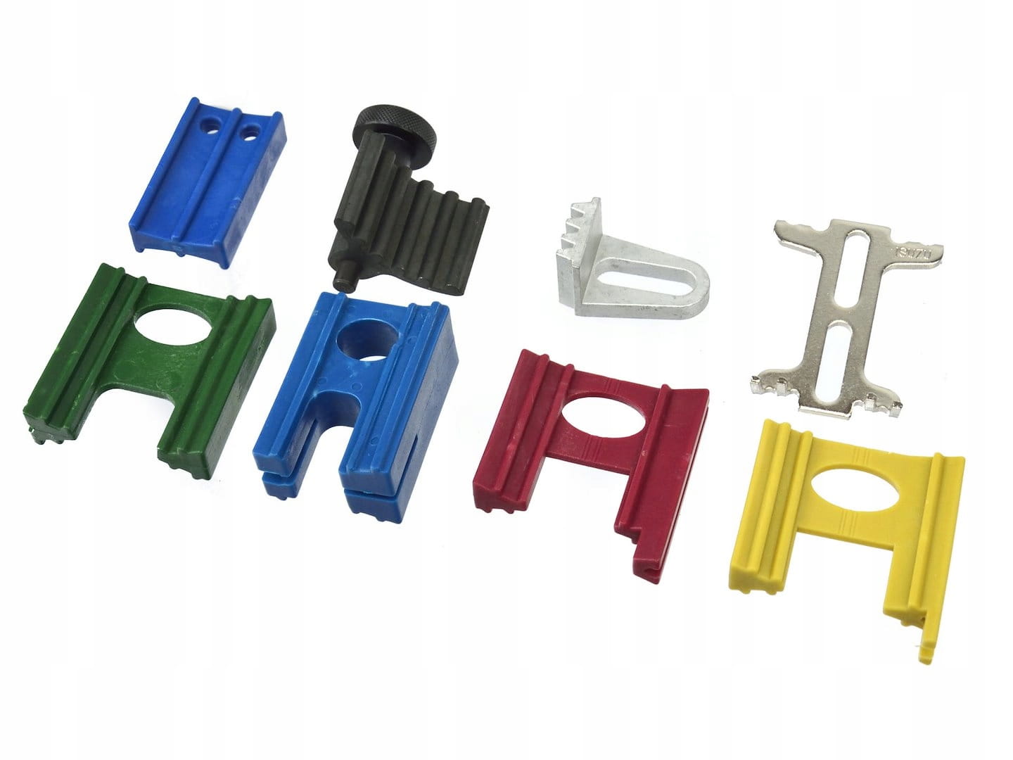 Zestaw składa się z 8 blokad, umożliwia unieruchomienie kół zębatych rozrządu w pozycji serwisowej, podczas wymiany paska rozrządu; specjalny kształt blokad pozwala na precyzyjne ustawienie punktów kontrolnych zapłonu; blokady unieruchamiają koło (koła) zębate rozrządu i wału korbowego
