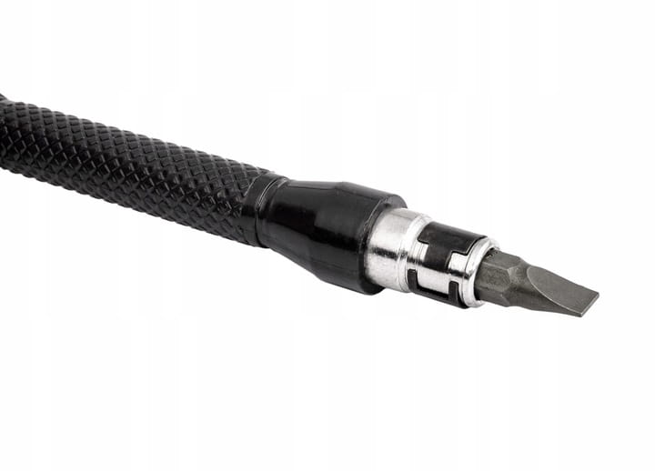 - Wkrętak wyposażony został w zatrzaski, które umożliwiają stabilne mocowanie bitów 1/4 cala pod kątem 90°.