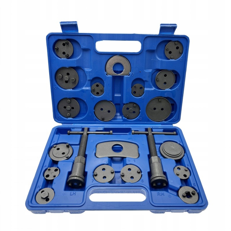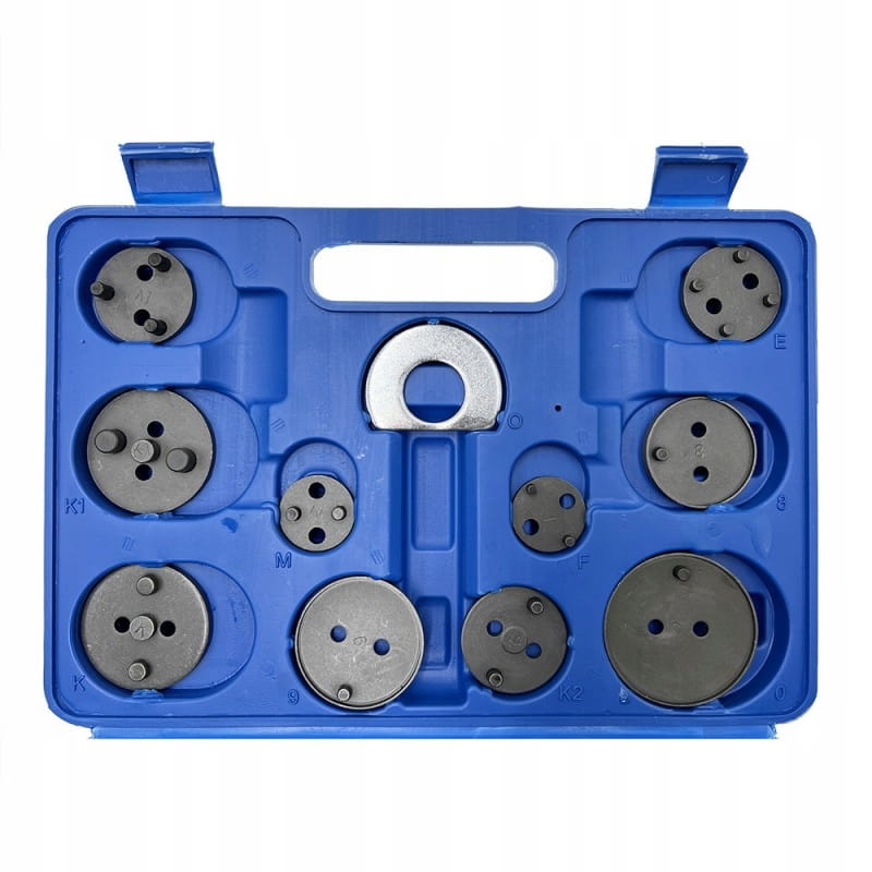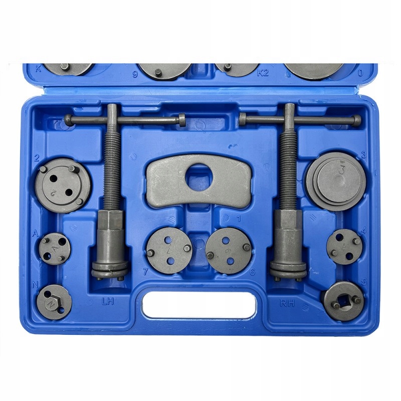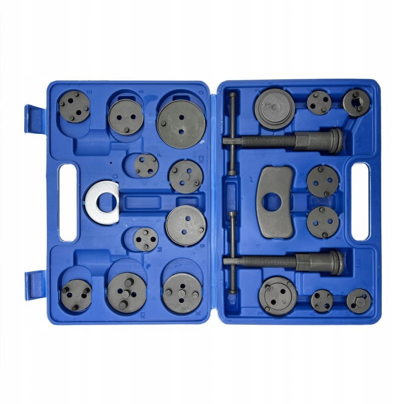 22-elementowy zestaw do cofania / wyciskania tłoczków hamulcowych, niezbędny przy naprawach pojazdów wyposażonych w hamulce tarczowe.