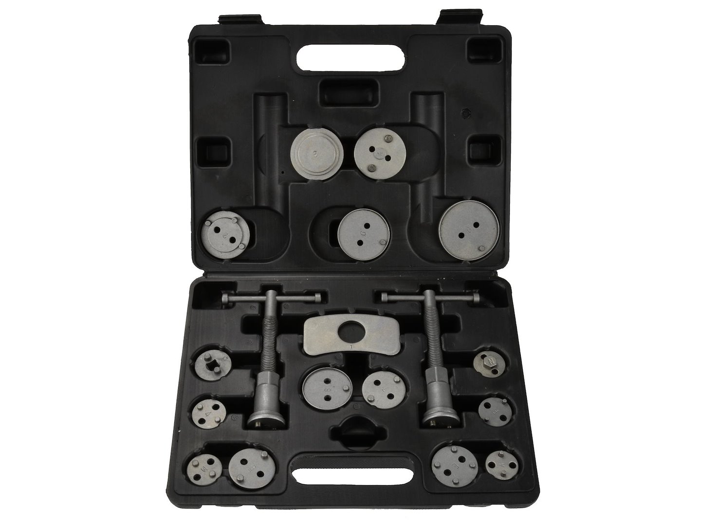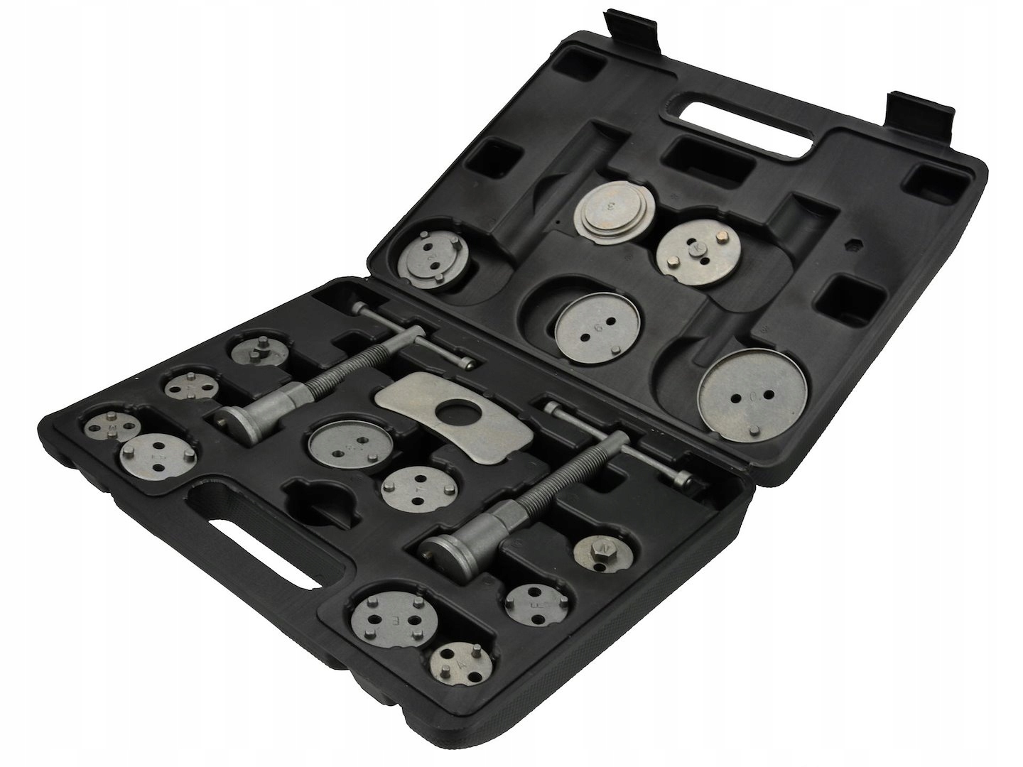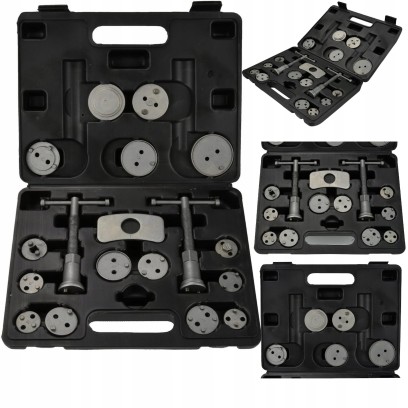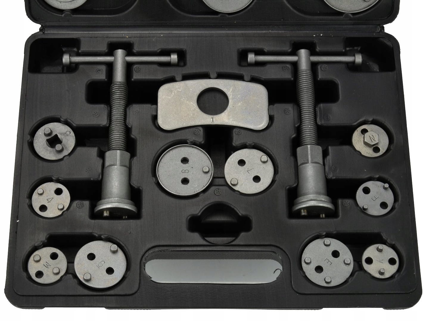 18-elementowy zestaw do cofania / wyciskania tłoczków hamulcowych, niezbędny przy naprawach pojazdów wyposażonych w hamulce tarczowe.