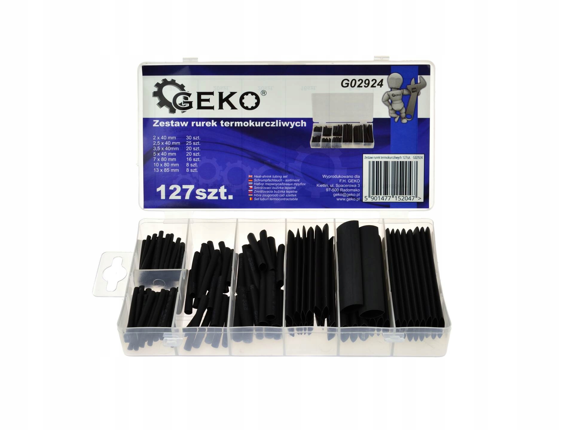 W skład zestawu wchodzi 127 sztuk rurek termokurczliwych w 7 popularnych rozmiarach. Są one przechowywane w praktycznym organizerze, które znacznie ułatwi szukanie odpowiedniego rozmiaru