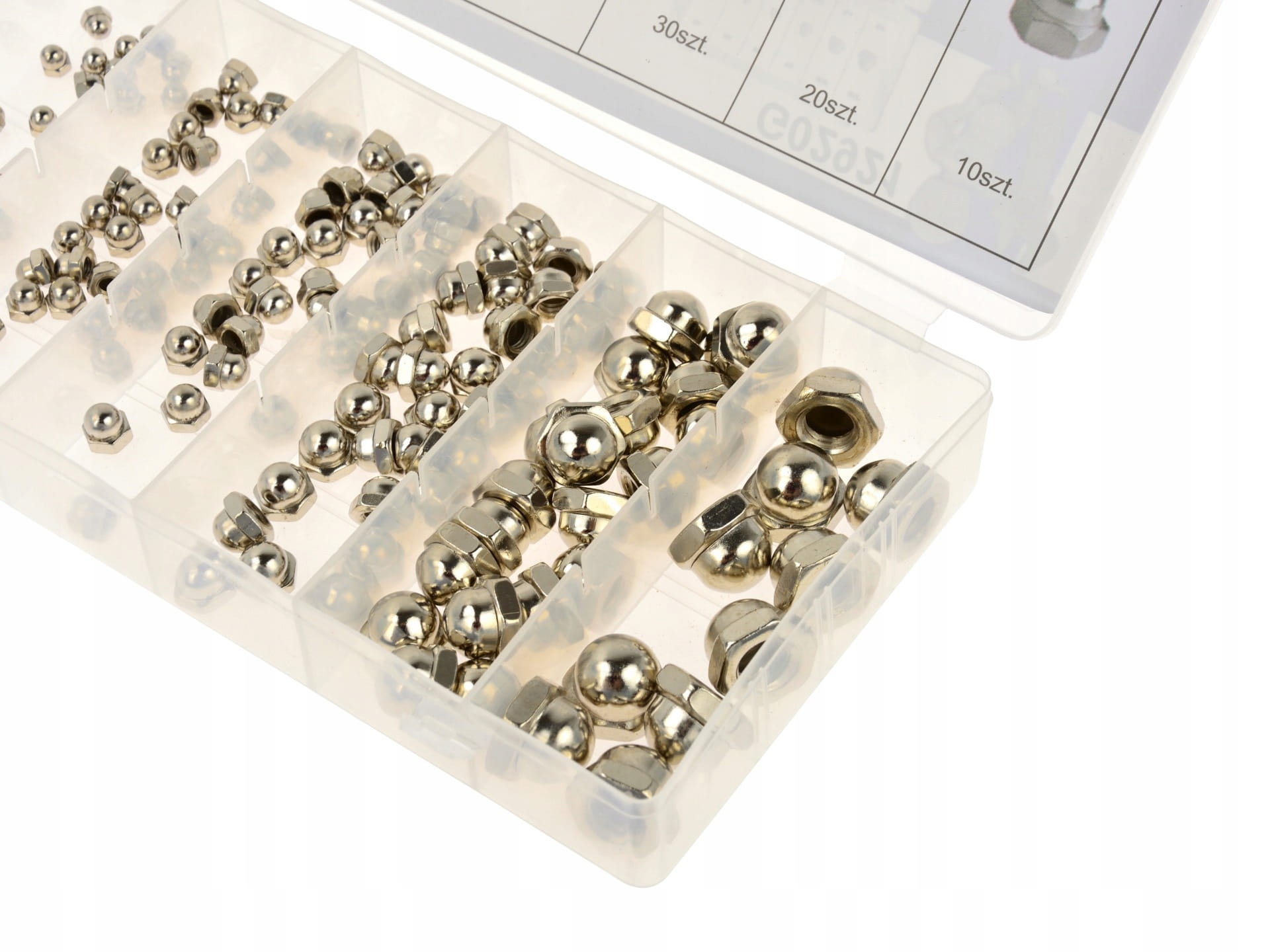 Zestaw nakrętek kołpakowych. W opakowaniu nakrętki w rozmiarach M3, M4, M5, M6, M8, M10. Najczęściej używane do mocowania felg i kołpaków samochodowych.