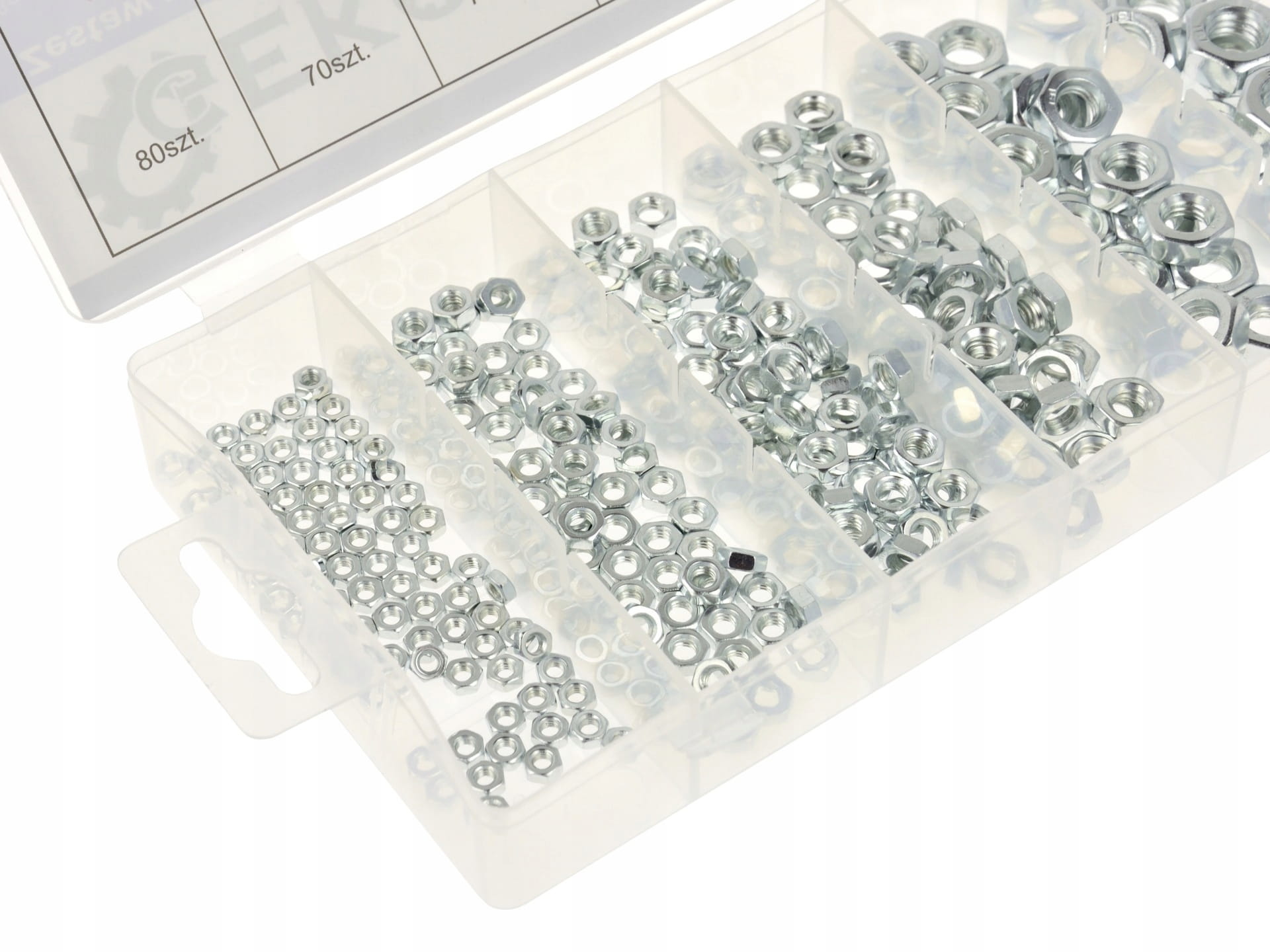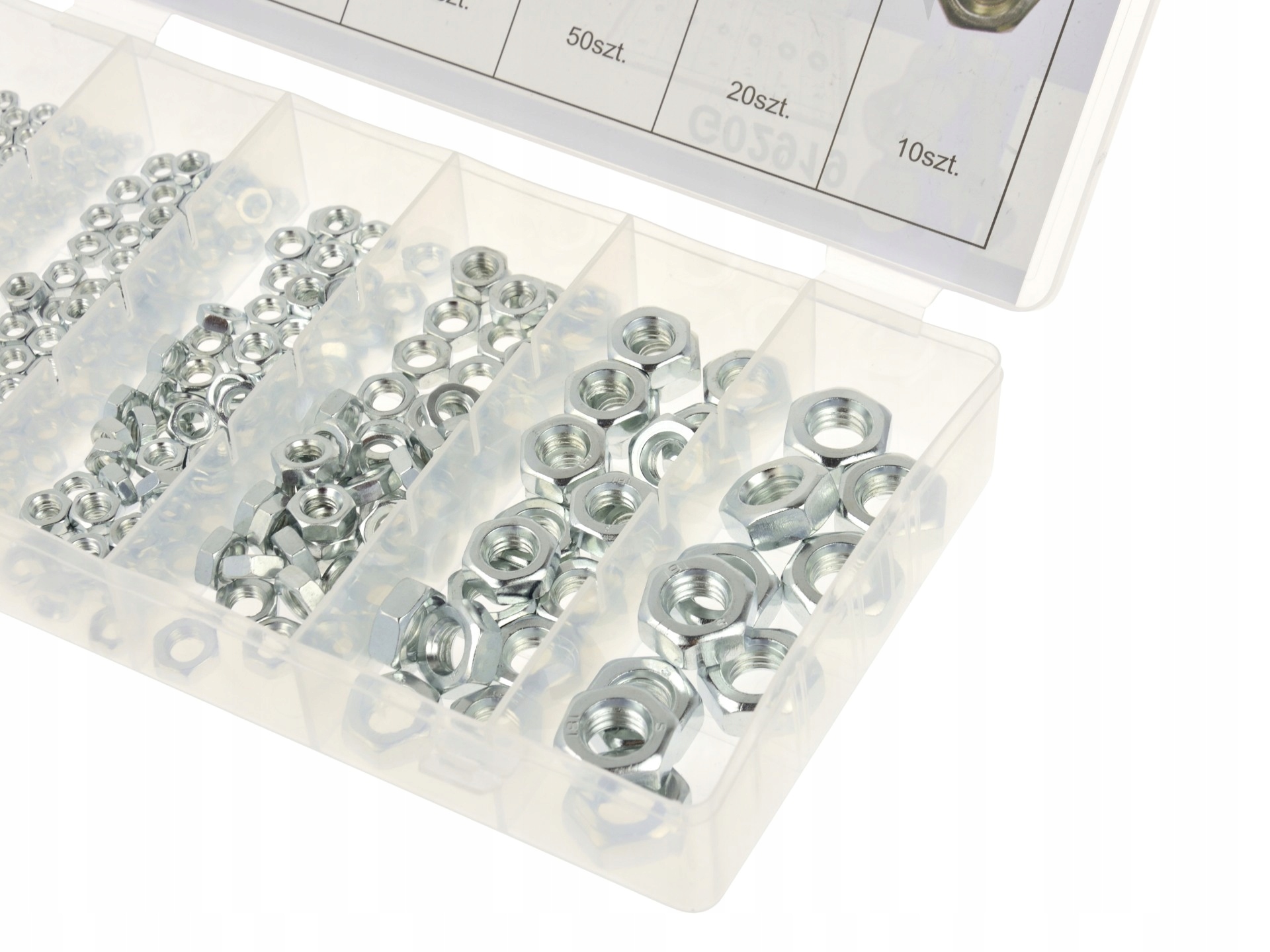 Zestaw nakrętek ze stali nierdzewnej. W opakowaniu nakrętki w rozmiarach M3, M4, M5, M6, M8, M10.