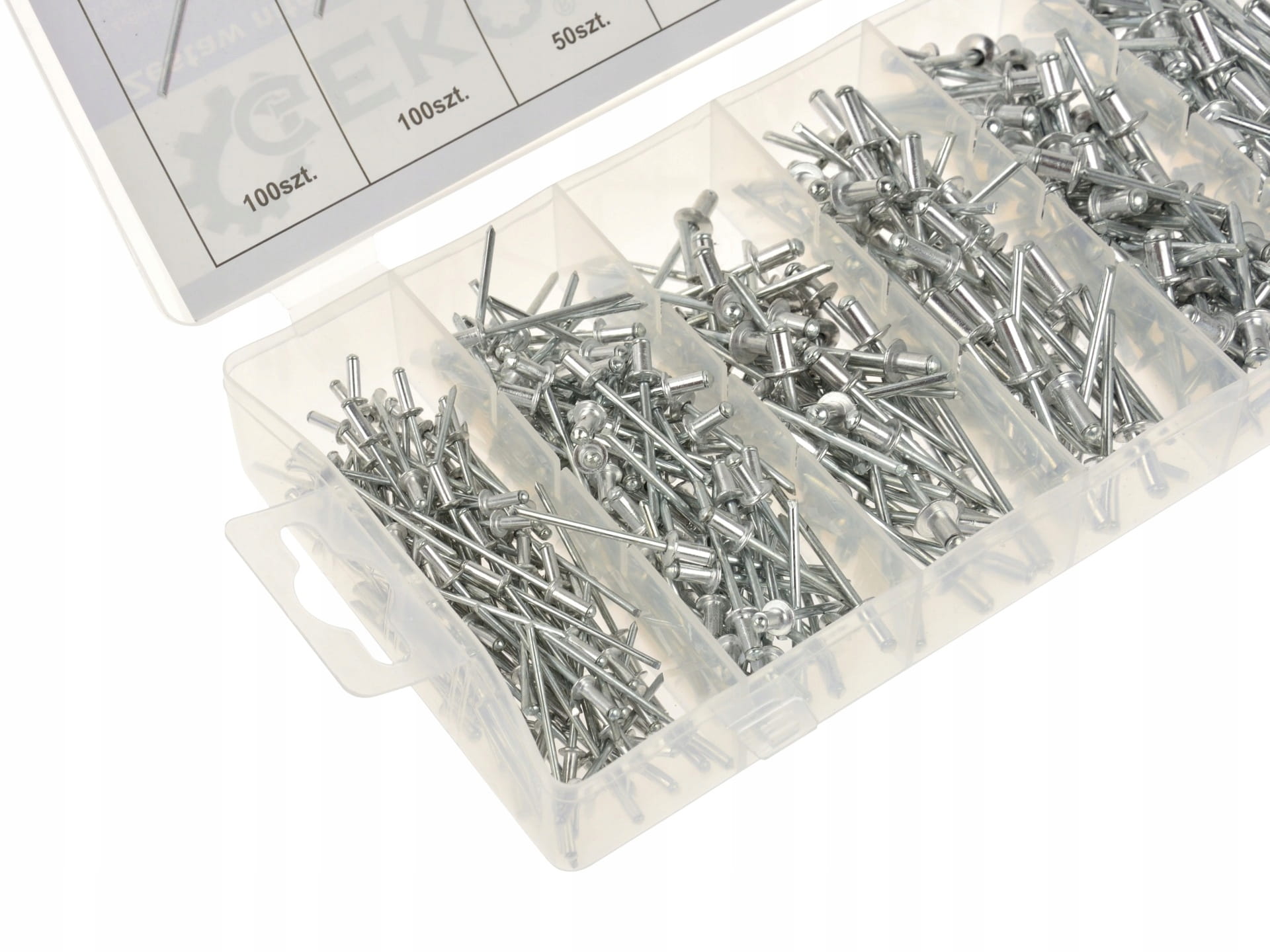 Zestaw nitów zrywalnych. Kołnierz nitu wykonano z aluminium, natomiast trzpień ze stali nierdzewnej. W zestawie 400 sztuk w popularnych rozmiarach.