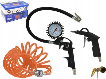 Zestaw pneumatyczny do pompowania i przedmuchiwania z zestawem końcówek do pompowania i wężem pneumatycznym o długości 5m.