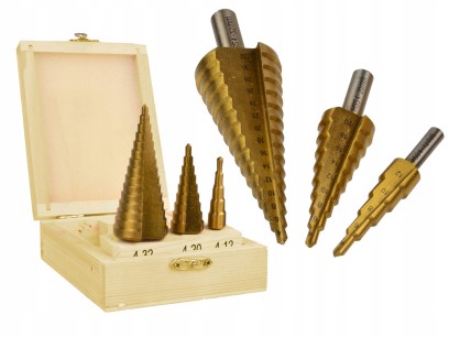Komplet wierteł stopniowych ze stali HSS powlekanej warstwą tytanu. Zestaw pozwala na wiercenie idealnie okrągłych otworów w stali, mosiądzu, miedzi, aluminium, drewnie i tworzywie sztucznym.