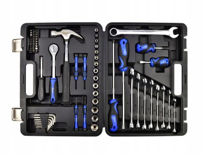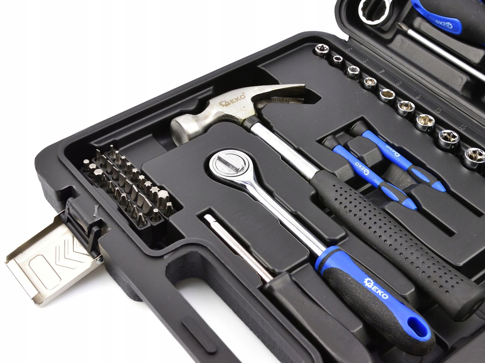 Funkcjonalny zestaw zawierający najbardziej przydatne narzędzia niezbędne w każdym domu, zapakowane w praktyczną walizkę z tworzywa sztucznego.